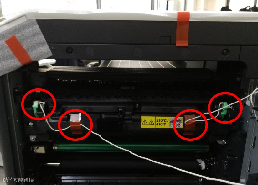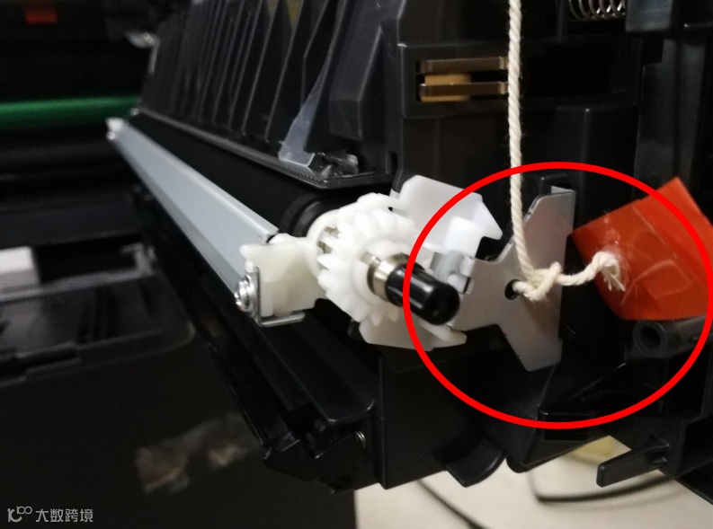 2、取下转印辊和定影的绳子上的固定铁片和黄色固定件。