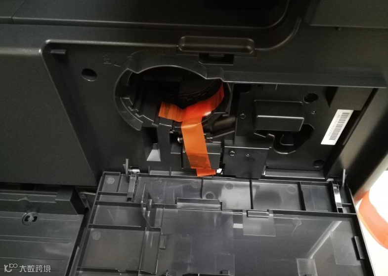 3、打开前门取下下粉口的封条。(提醒:必须拆封条后再开机)