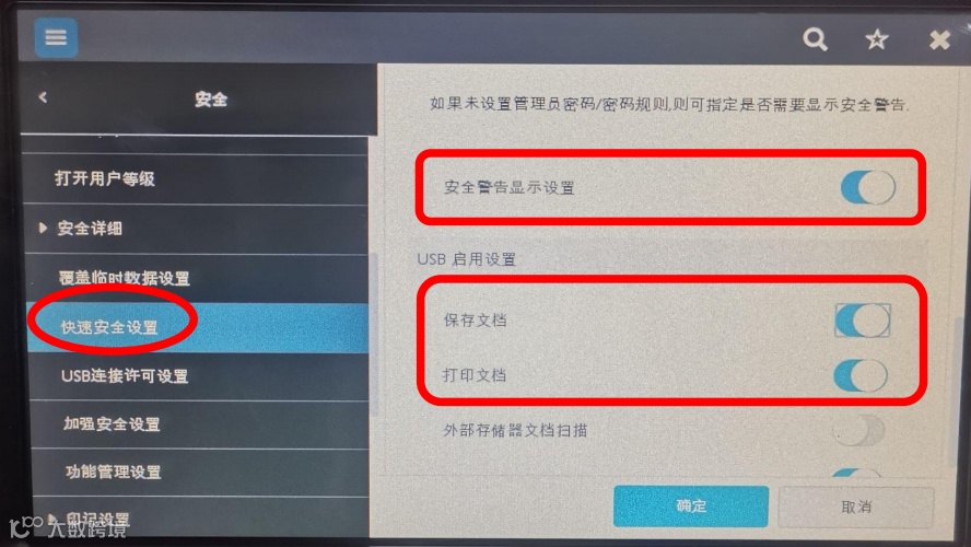 17、关闭安全警告提示,USB 启用设置 2 项均设为开启,这样才可以用 U 盘扫描。