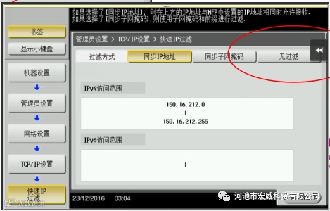 19、进入管理员模式,选择【网络】,选择【快速IP过滤】,关闭IP过滤。(解决跨网无法打印的问题)