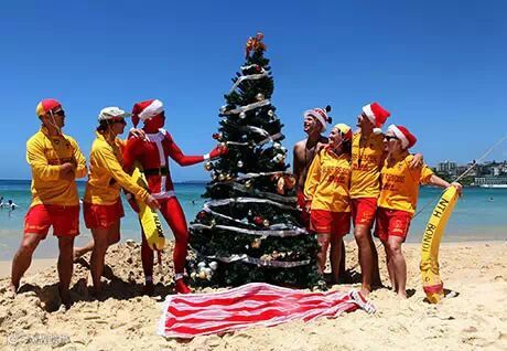 4.圣诞节在盛夏时刻,圣诞老人穿着裤衩站在海边吹海风;