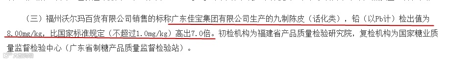福州沃尔玛百货有限公司销售的标称广东佳宝集团有限公司生产的九制陈皮(话化类),铅(以Pb计)检出值为8.00mg/kg,比国家标准规定(不超过1.0mg/kg)高出7.0倍。