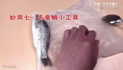 勺子的边缘也能用来刮鱼鳞,还比刀拿着轻巧。(去鱼鳞的时候用个塑料袋装着鱼,可以避免鱼鳞四处溅)