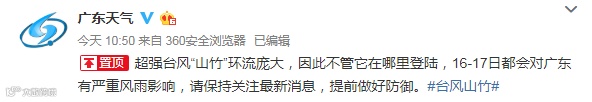 而且@广东天气 也再次强调了“山竹”的影响▼