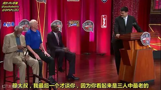 进入正题,姚明感谢了三位推荐人,穆大叔(迪肯贝•穆托姆博)排到最后.....认真听姚明说什么的穆大叔,一定不知道下面的一波调侃会突然来袭......穆大叔也被调戏了!!!!