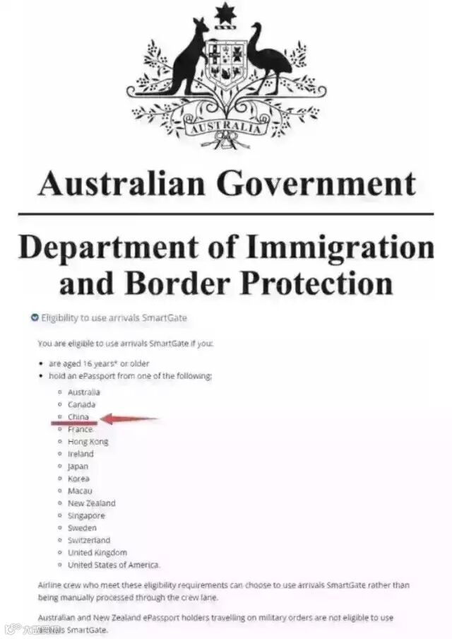6月20日,澳大利亚移民和边境保护部宣布,年满16岁持中国,中国香港及中国澳门电子护照的赴澳旅客从即日起可以在澳大利亚的八个主要国际机场使用“智能门(SmartGate)”服务自助通关,此举将大大便利包括留学生在内的前往澳大利亚的中国旅行者。