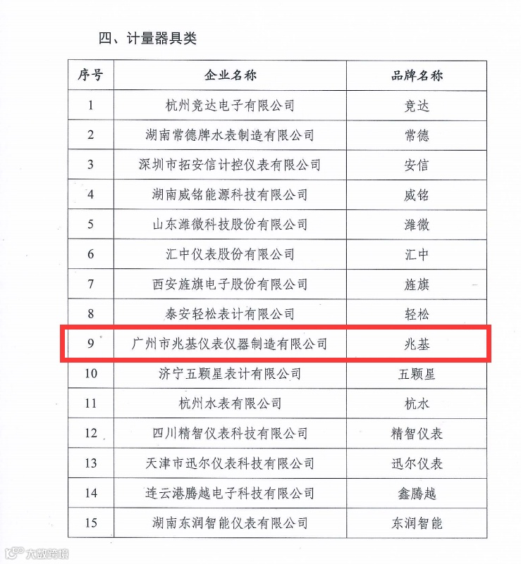 10月19日,广西城镇供水排水协会于12日至16日召集专家对自愿参加并按照规定提交了申报材料的企业进行了评选,将逆得入选“品牌推荐名录”的企业及名牌名称进行公示;在在公示目录当中,兆基仪表入围在计量器具类推荐名录内。