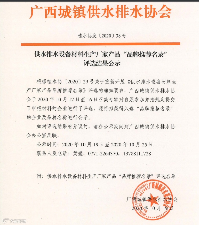 9月1日,兆基仪表接到广西城镇供水排水协会发布“关于重新开展《供水排水设备材料生产厂家产品品牌推荐名录》评选的通知”后,积极参与、提交申报于本次评选,并按照其规定提交相关资料。