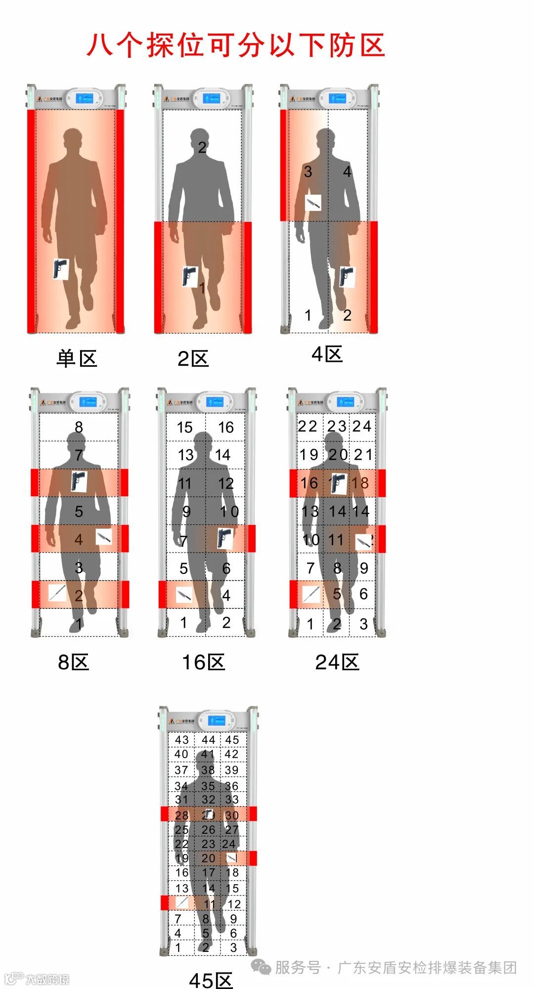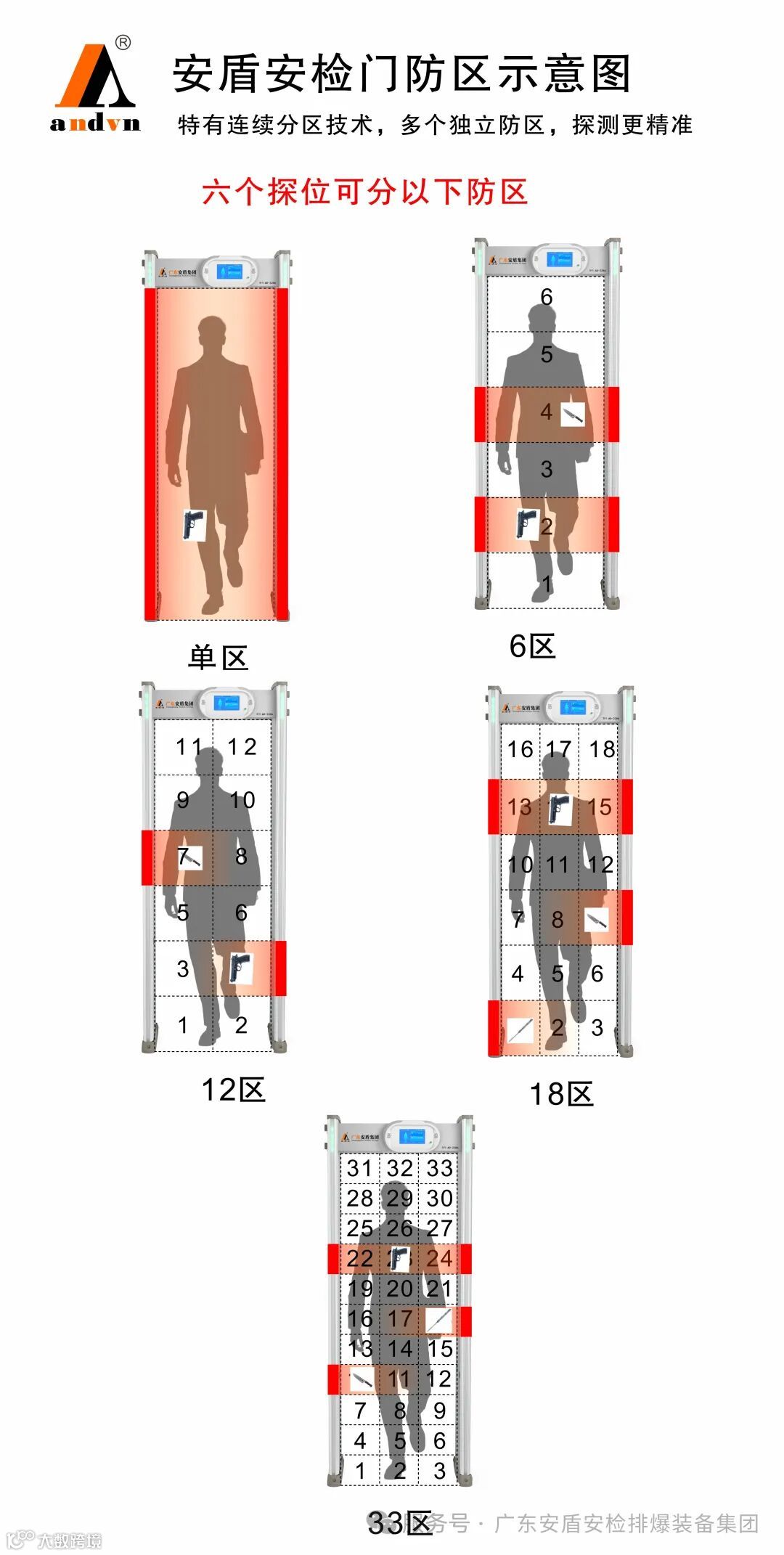 安检门的防区,简单来说,就是将通过安检门的人体进行区域划分,以便更精准地探测金属物品所在位置。安盾安检门采用了特有的连续分区技术,把人体可能携带金属物品的区域进行细致划分。比如,从单区到多区的设置,有6区、12区、18区,甚至多达33区、45区等不同模式。这种分区并非随意为之,而是依据人体结构和常见金属携带位置,经过科学设计确定的。