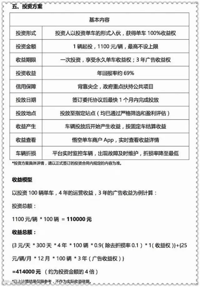 个人或商家投资每辆单车价值1100元,便可以获得单车运营收益的70%。