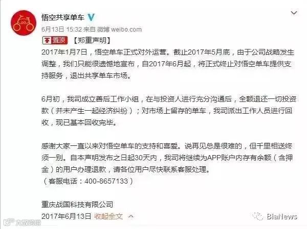 Bianews发现,6月13日,上线仅5个月的共享单车品牌“悟空单车”通过官方微博宣布退出市场,原因是公司战略发生调整。