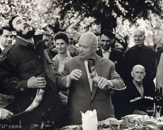 1963年,斯大林的故乡格鲁吉亚。赫鲁晓夫和卡斯特罗人手一个牛角杯,痛饮一杯伏特加。