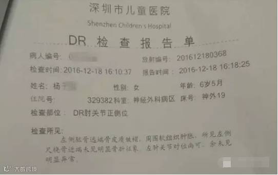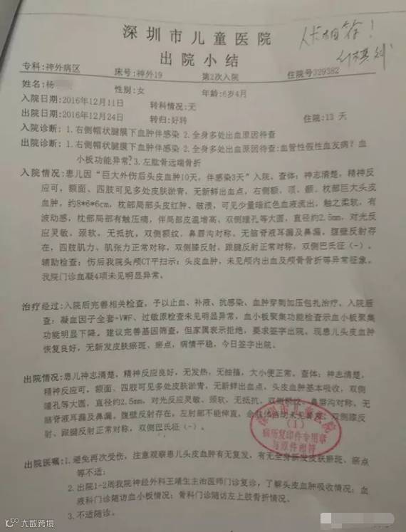 更夸张的是,深圳市儿童医院的一份病例显示,2016年12月11日,小星星因巨大外伤后头皮血肿住院,检查全身多处皮肤淤斑;右侧额、顶、枕部巨大头皮血肿,枕部局部头皮红、破溃,可见少量暗红色血液流出。
