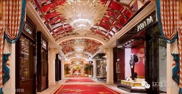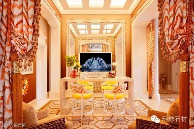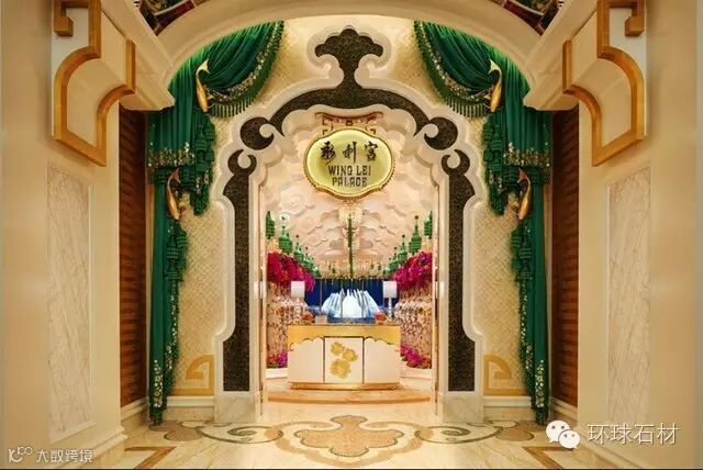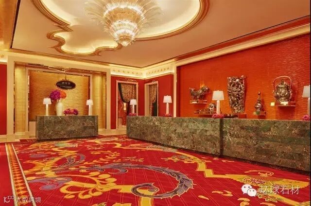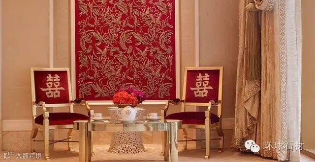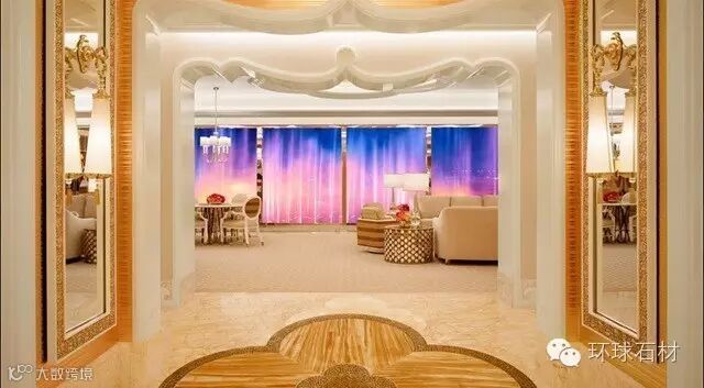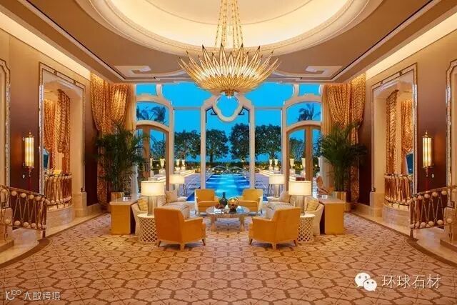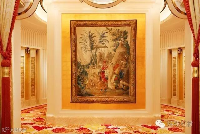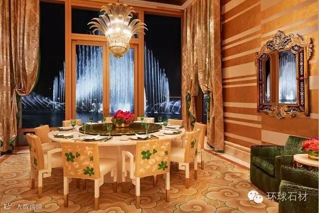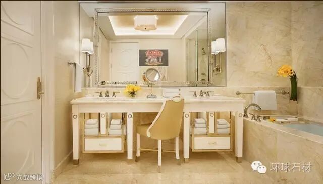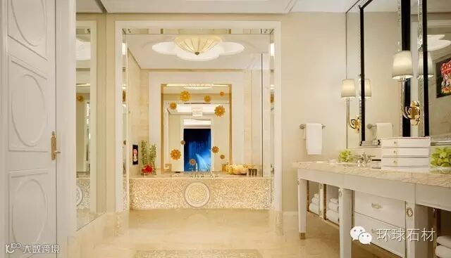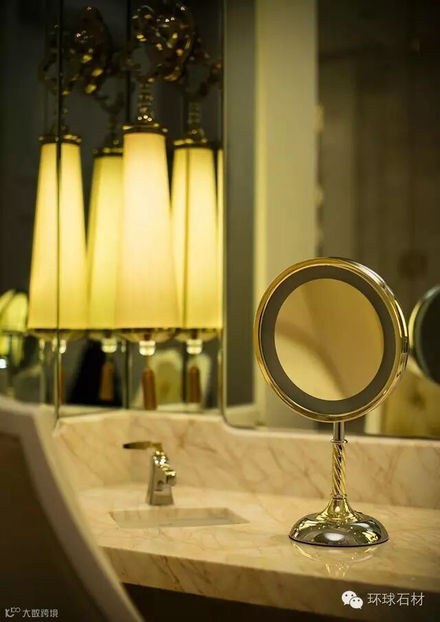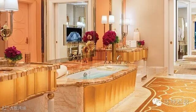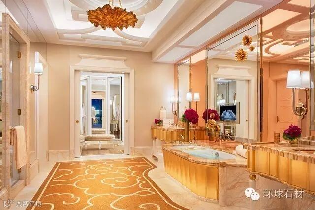 浴室里大胆的运用金蜘蛛杂乱无章的纹路特点,独特的纹理色彩,夸张的线条,彰显了永利皇宫不凡的品味和艺术修养。