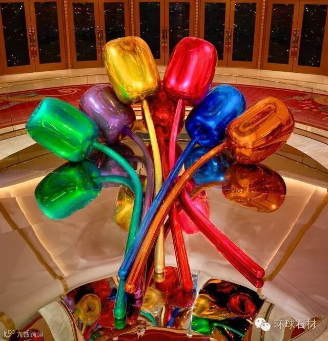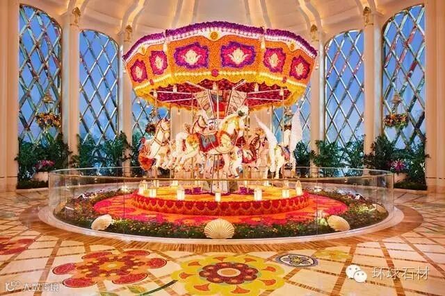 超过83,000朵花卉打造的七彩《旋转木马》,以及由102,000朵花卉组成、高达21呎的巨型《摩天轮》,雕塑四周采用了金蜘蛛与新鹅毛金的水刀拼花地面,金蜘蛛的杂乱无章与新鹅毛金的规则条纹形成强烈对比,加上灵动的马赛克花朵图案进行升华,以动静结合的设计带出强烈的视觉冲击。