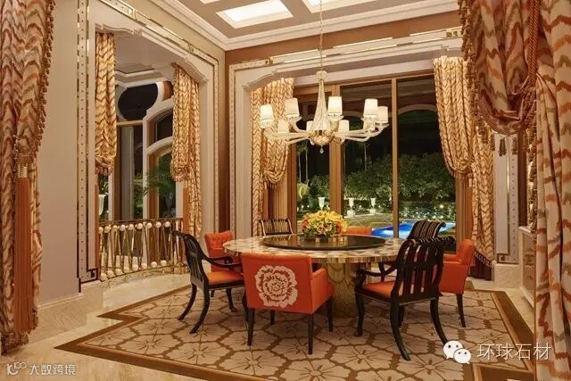 其中,订制的精致小餐桌也成为花园别墅的其中一个焦点,金蜘蛛、黄虎眼的水刀拼花台面,与别致的金蜘蛛桌脚融为一体,整体设计浑然天成,缔造出别具一格的高雅品味。
