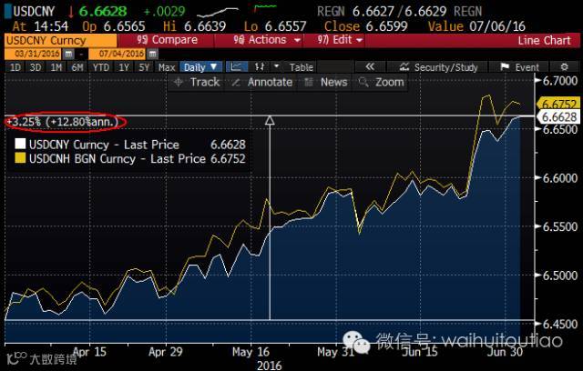 最近三个月,在岸人民币兑美元汇率,以及离岸人民币兑美元汇率也贬值了3.25%,年化12.8%。