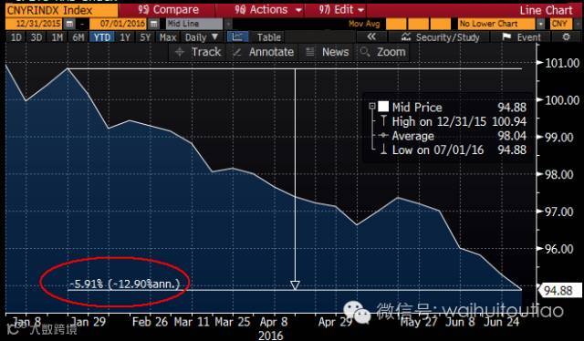 年初至今,人民币兑一篮子货币汇率已经贬值了5.9%,年化13%。CFETS人民币汇率指数跌至94.88,创去年12月指数创立以来最低。