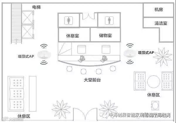 大堂AP布置:酒店大堂空间较大,障碍物比较少,可根据大厅规模部署吸顶式AP。