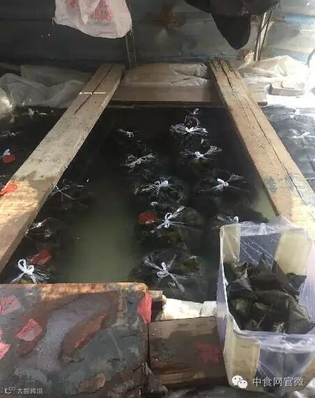 大棚的尽头并排放置着四个蜂窝煤炉子,上面的大锅里正蒸着粽子。大棚里有六只金属大桶和两个用水泥砌的池子,池子里灌满了水,所有蒸熟的粽子都会在这里完成最后一道工序流程——冷却。每个池子里都泡着几十包已经蒸好的粽子,水看着非常浑浊不清。