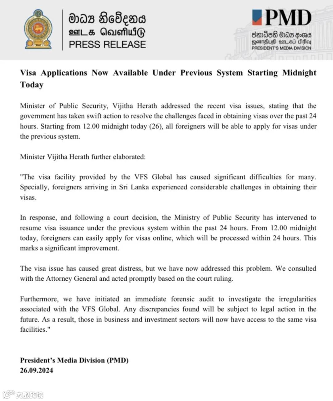 随后,斯总统新闻办发布消息称,斯公共安全部长维吉塔-赫拉特(Vijitha Herath)就最近的签证问题发表讲话,指出政府已采取迅速行动,解决过去24小时内申请签证所面临的难题。