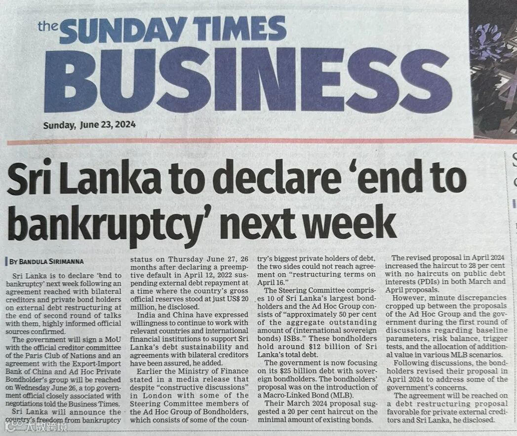 在 2022 年拖欠国际债务后,斯里兰卡则需要与海外债券持有人重新谈判约 120 亿美元的债务。