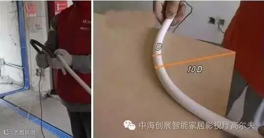 4、弯管:冷弯管要用弯管工具,弧度应该是线管直径的6倍,先排管,后用钢丝穿过,便于以后线路升级、维修。