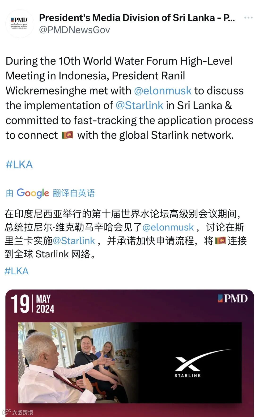 早些时候(如下图),斯总统拉尼尔-维克拉马辛哈说,埃隆-马斯克已发出在斯里兰卡启动星链服务的申请,将星链引入斯里兰卡的初步工作已经完成。