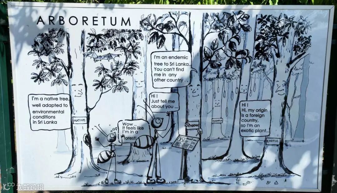 植物园中每种树植都带有颜色标签:绿色代表本土,黑色代表外来引进,红色代表兰卡特有,黄色代表含有有毒物质。