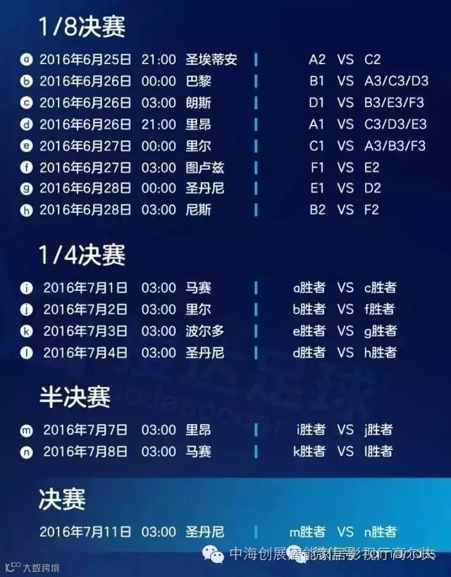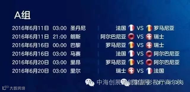 2016年法国欧洲杯完整赛程新鲜出炉。揭幕战将于北京时间2016年6月11日03:00举行,由东道主法国对阵罗马尼亚。小组赛中有英格兰VS威尔士、比利时VS意大利、德国VS波兰等多场焦点比赛。决赛将于北京时间2016年7月11日03:00举行。