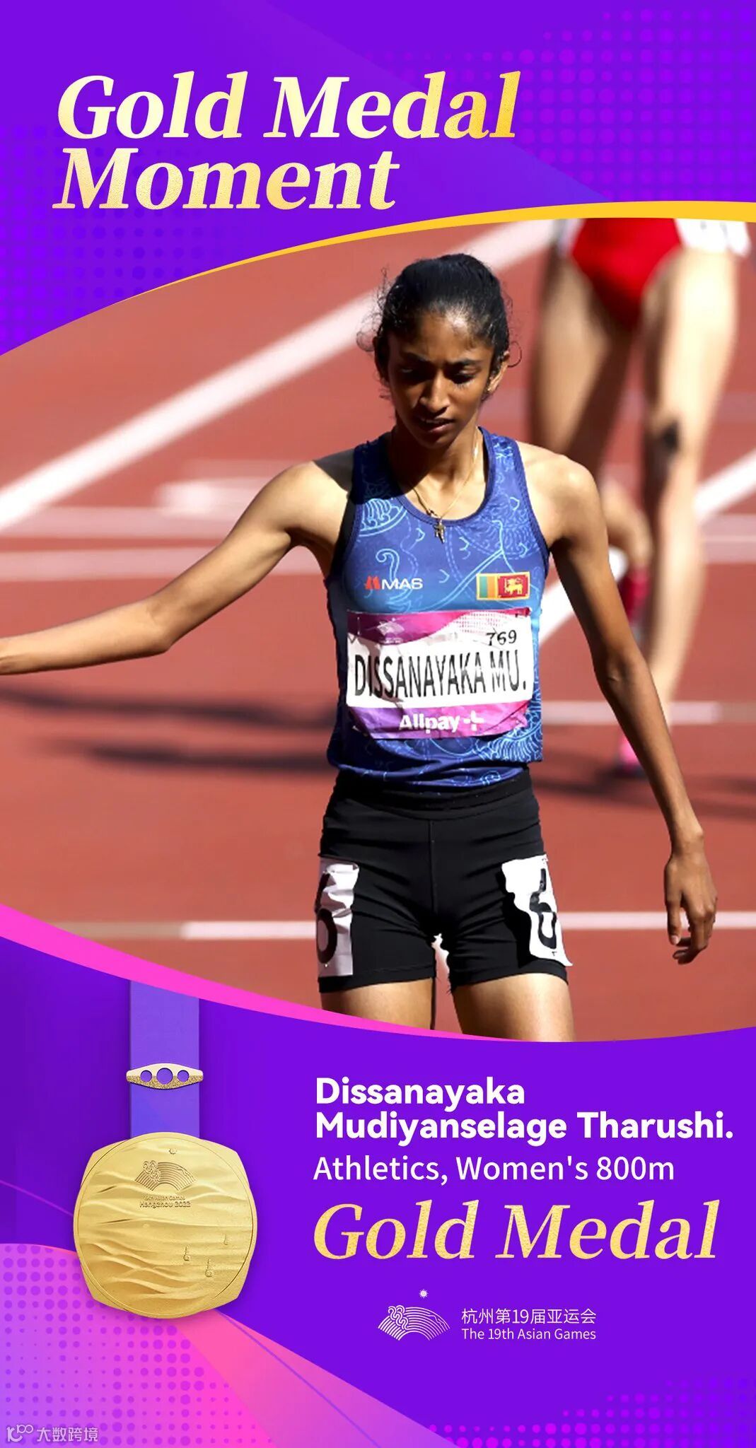 塔鲁什·卡鲁娜拉特纳 (Tharushi Karunarathna) 在女子 800 米比赛中以 2 分 03 秒 20 的成绩夺得金牌。这是斯里兰卡自2002年以来在亚运会田径比赛中获得的首枚金牌!