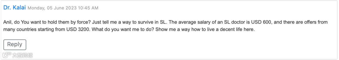 “阿尼尔,你想用武力控制他们吗?请告诉我一个在斯里兰卡生存的方法。兰卡医生的平均工资是600美元,而许多国家是从3200美元起的。你想让我做什么?告诉我一个如何在这里过上体面生活的方法。”