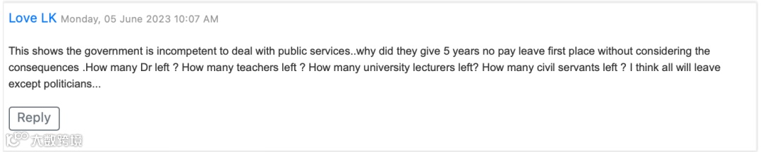 “这表明政府在处理公共服务方面是无能的。为什么他们首先给5年无薪假期而不考虑后果呢?有多少博士离开了?有多少老师离开了?有多少大学讲师离开了?有多少公务员离开了?我认为除了政治家,所有的人都会离开......”