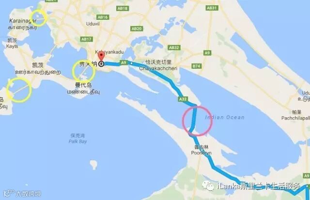 贾夫纳有好几座岛屿,与半岛连接的几条公路均在海上(黄色圈内所示),但最好看的部分还是在入城前的那一段(红色圈内所示)。这条公路最美的时候应是夕阳西下的时候,晴天白天时也很不赖。一眼望去,海水与天空相接,一条笔直的公路向远处延伸不见尽头,仿佛消失在浅浅的海水中。