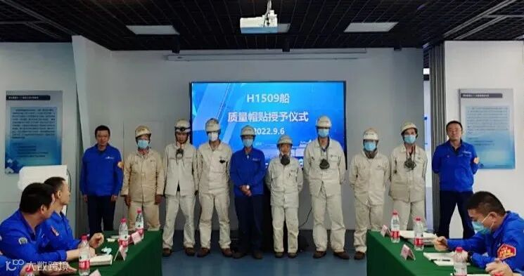 会上对首批TK质量免检班组进行授牌,并为H1509船制造一/二部施工人员代表授发质量帽贴。