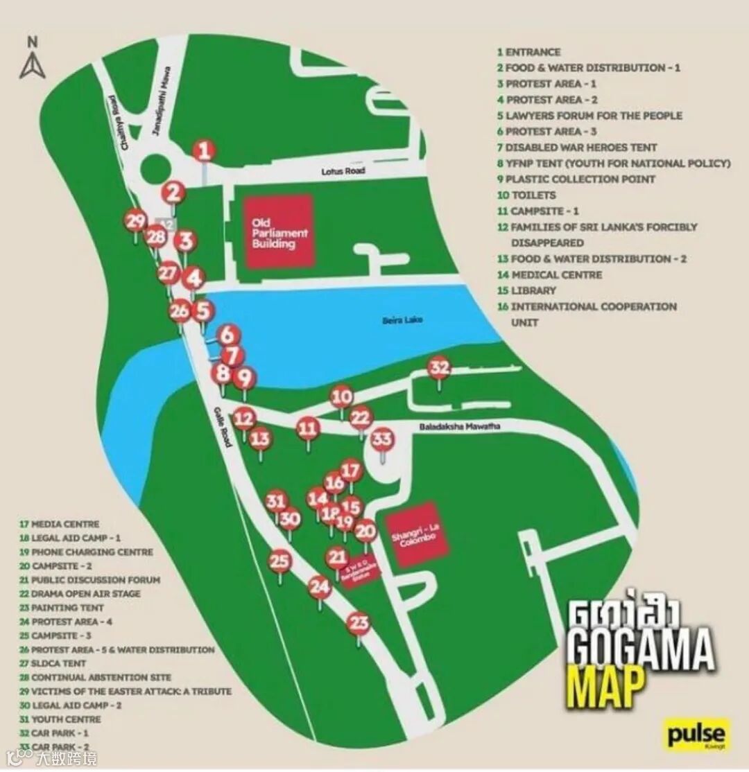 今天是在总统秘书处门前和平抗议的第15天,当地网络上已就该区域的“Gotagogama村庄”做了功能区图示,除了抗议区域之外,还设置了包括食品发放区、医疗中心、厕所、塑料垃圾收集点、媒体中心、法律援助中心等。