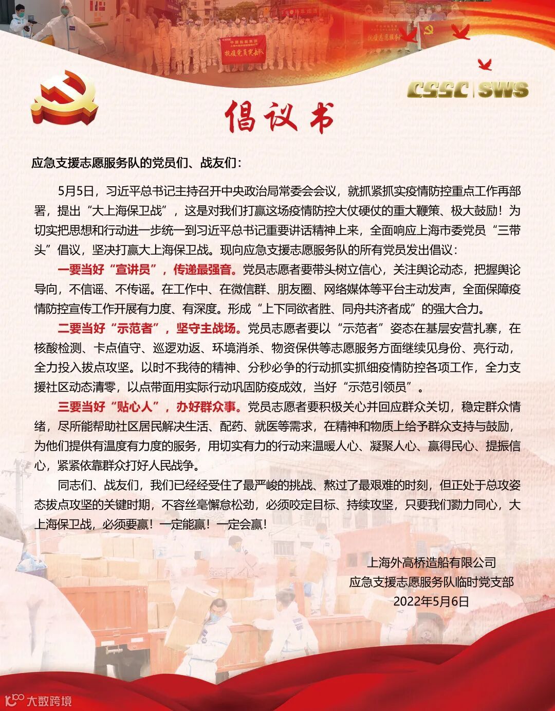 4月17日—5月31日,500名志愿者把党史学习教育成果转化为战疫必胜的决心和行动,日夜交替坚守在抗疫一线,主动挑最重的担子,勇于啃最硬的骨头,和当地镇政府、街道、社区居委一起共筑疫情防控大合力,为坚决打赢“大上海保卫战”注入“中国船舶外高桥造船力量”。