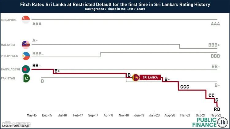 在过去7年的时间里(2015年5月至2022年5月),斯里兰卡的惠誉信用评级已被下调了7次,其中5次降级发生在2020年4月以后。相比之下,其区域内的同行都保持住了其信用评级。