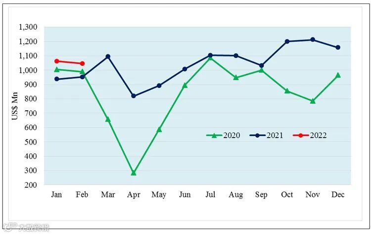 根据斯海关公布的数据,今年2月兰卡的商品出口比去年同期增长了9.91%,达到10.46亿美元。