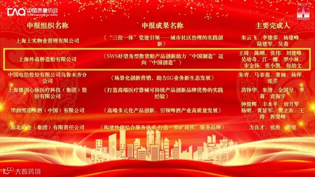 会上发布了2021年中国企业品牌创新成果。本年度品牌创新成果涵盖品牌战略、产品/服务、品牌文化、履行社会责任、品牌传播五类,经过初审和复审,全国共有39家优秀企业荣获“2021年中国企业品牌创新成果”,公司申报的产品/服务类成果《SWS好望角型散货船产品创新助力“中国制造”迈向“中国创造”》就是其中之一。这是公司首次获得该奖项,充分展现了业界对SWS好望角型散货船由“中国制造”成为“中国创造”的高度认可。