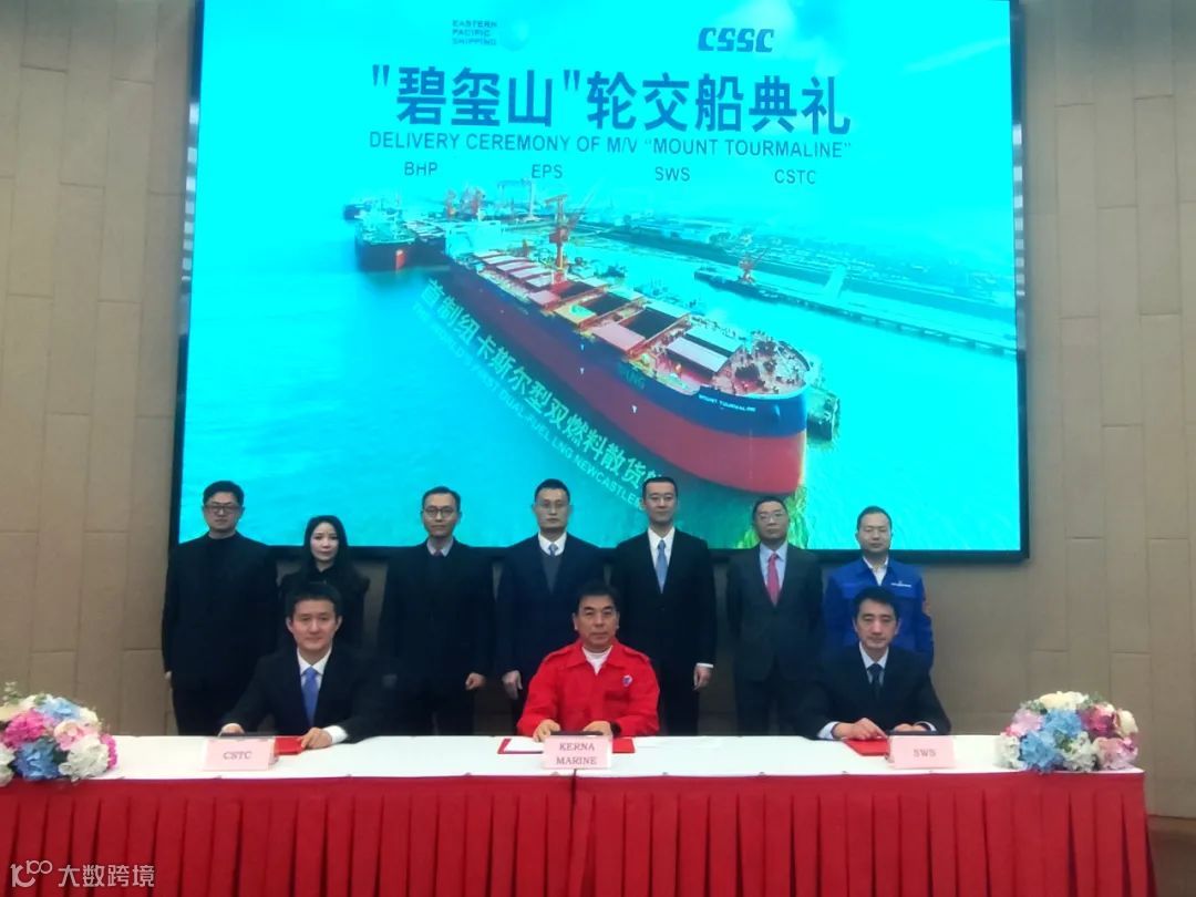 船东EPS驻厂组经理姜明焕、中船贸易船海业务一部副总经理郑民胜、外高桥造船市场营销部部长叶杰代表各方签署交船文件。租家必和必拓(BHP)铁矿市场经理井汇,英国克拉克森上海代表处董事周吉樑,美国船级社华中区高级验船师Han Young Bae,外高桥造船副总经理张启鹏等见证签约。