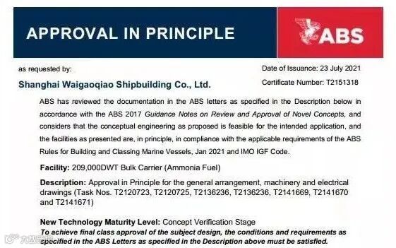 2021年8月,外高桥造船最新研发的氨燃料动力21万吨散货船获得ABS船级社颁发的原则性认可证书(AIP)