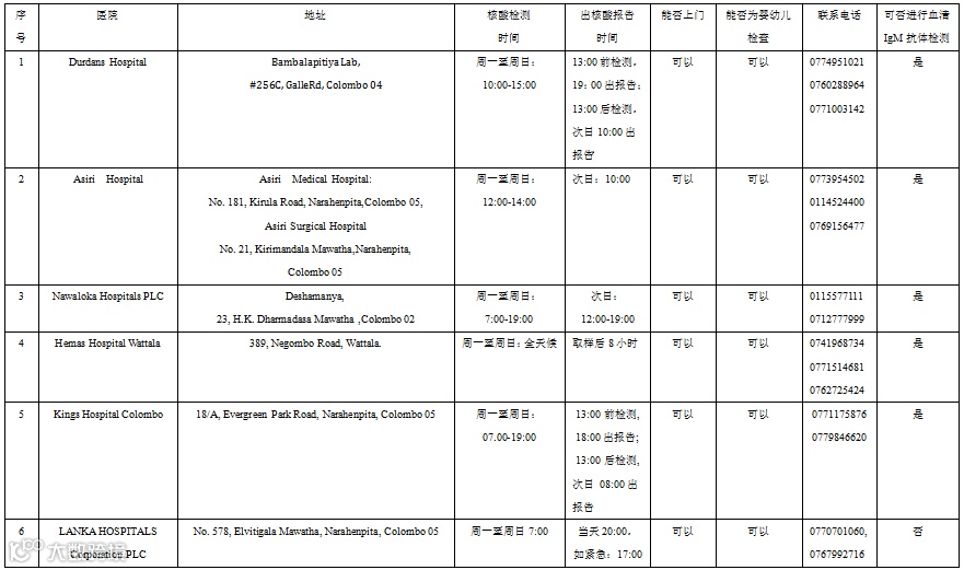 核酸检测及血清抗体检测(简称“双检测”)的指定医院除了新增了Kings Hospital Colombo医院(Lanka Hospitals医院的东北方向),Durdans医院的电话有更新。