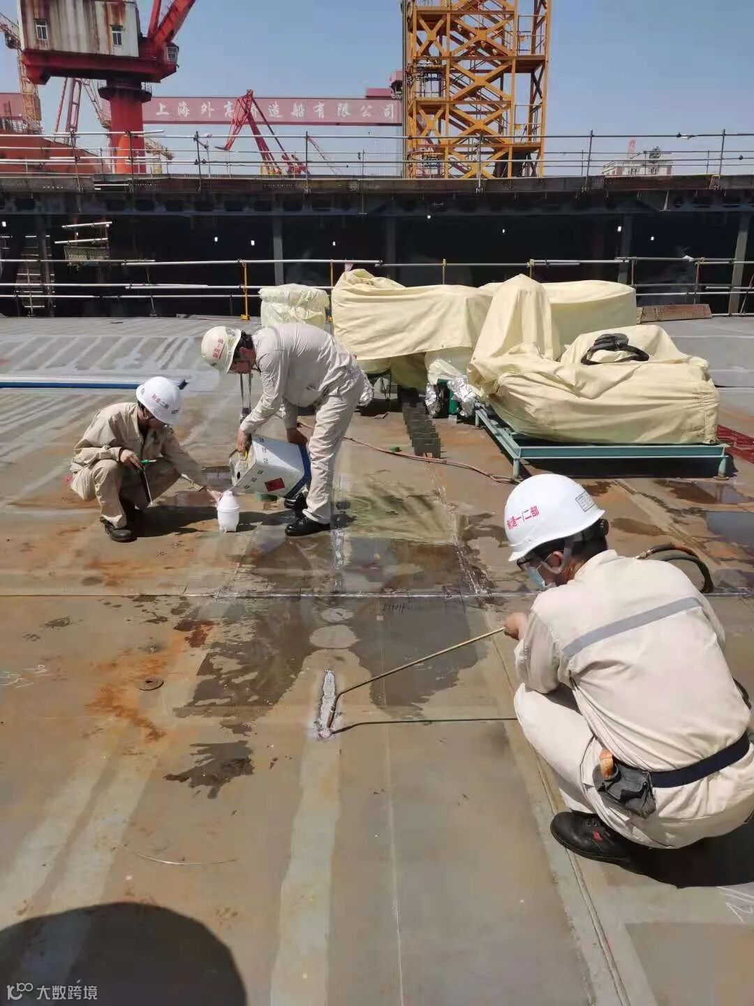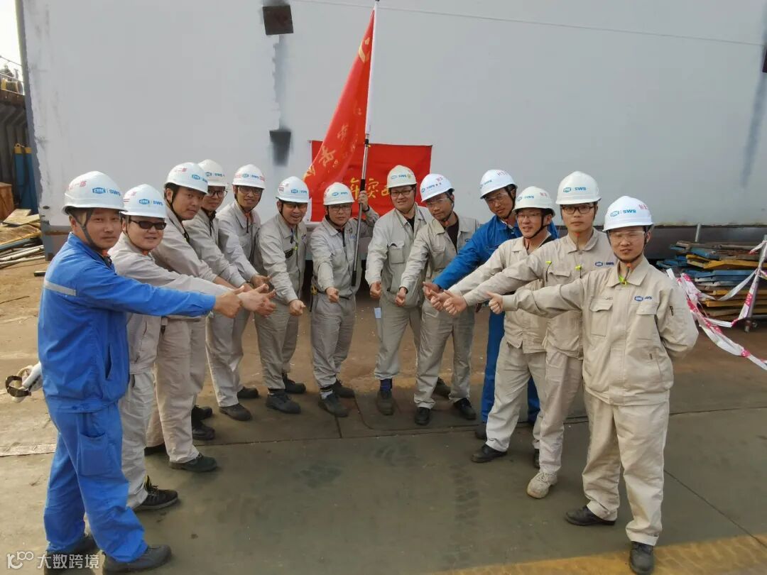 这样令人感动的奋斗场面和动人事迹还有很多。建造期间,正值夏日炎炎,大家在烈日下坚持工作,一边顶千斤顶、拉葫芦,一边用火枪将钢板加热到600℃左右的高温。现场阵阵热浪,施工人员挥洒着汗水,坚守岗位。艏部舷墙矫正期间突遇暴雨,为了争取时间,大家穿着雨披坚持工作。雨披本身不透气,加上夏天穿雨披再进行高温作业,其中“滋味”常人难以想象。虽然汗流浃背,酷暑难忍,但大家丝毫没有退缩。