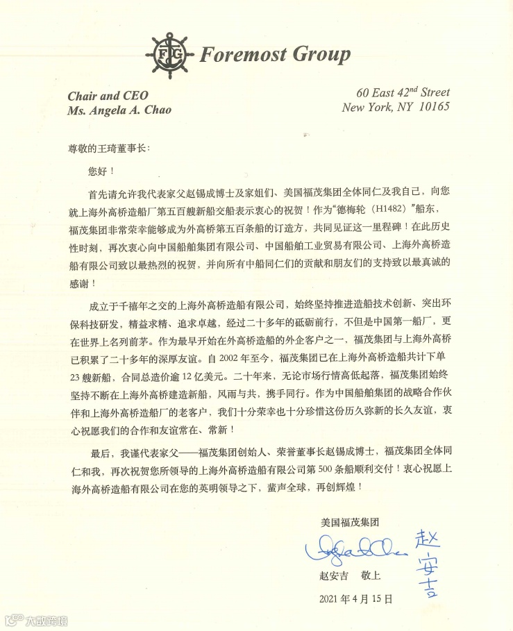 “美国福茂集团非常荣幸能够成为外高桥造船第500艘船的订造方、非常荣幸能够见证外高桥造船取得新的里程碑节点。”