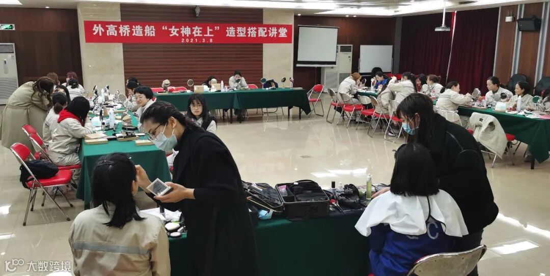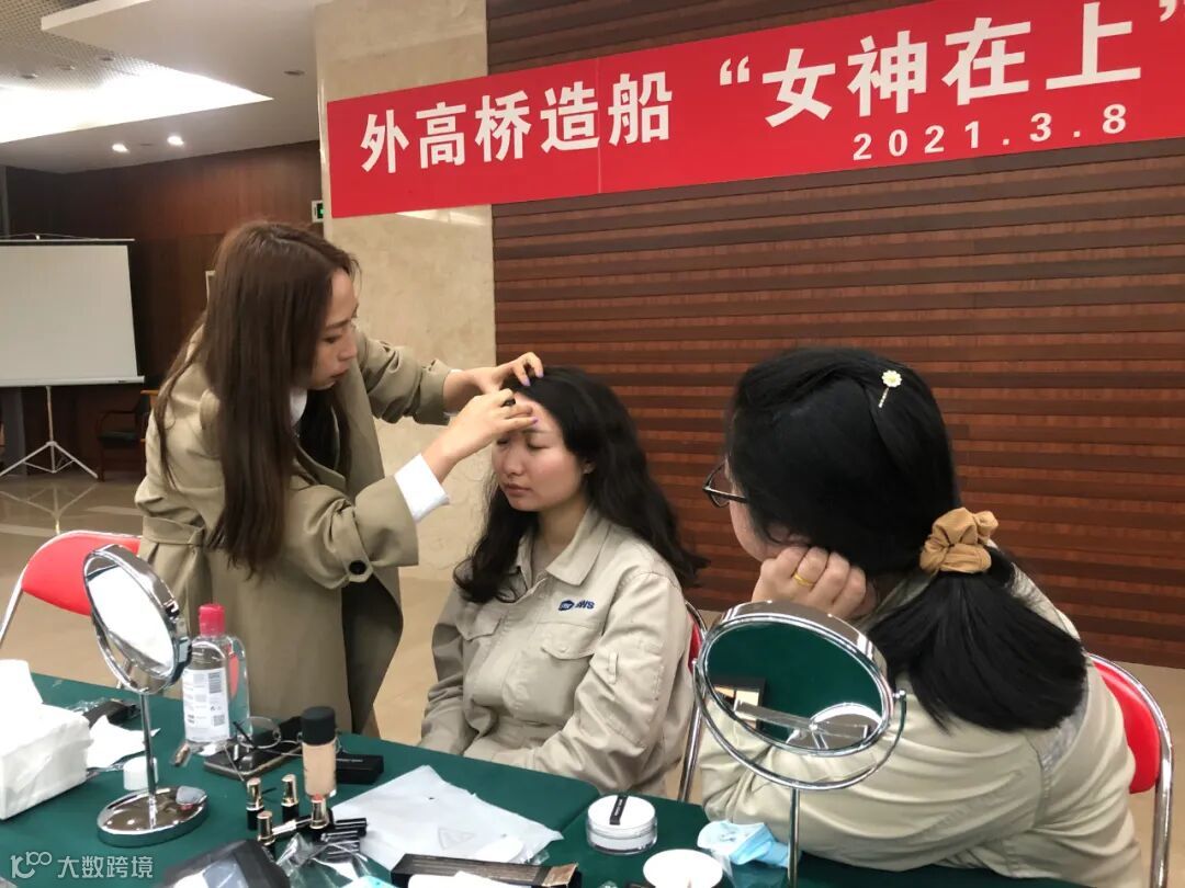 活动现场,专业化妆师从洁面、妆容与色彩、衣着发型搭配等每个环节进行了细致地讲解,并通过在模特脸上生动演示,使大家快速掌握了妆容及造型搭配技巧。在相互化妆造型的实践中,大家积极踊跃,打底、修眉、化影、抹腮、造型等每个步骤精益求精,短短的半小时内一个个精致优雅的妆容呈现在眼前,纷纷感慨惊讶道:“原来我们造船女工可以这么美!”