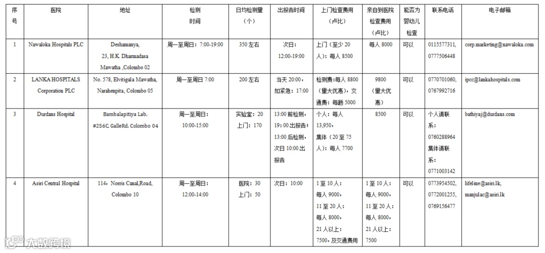 核酸检测应于乘客中转登机前5天内在我馆指定的检测机构(见如下表格)完成。检测前,请向检测机构提供身份证件、回国日期及航班等信息,提醒检测机构第一时间将检测报告扫描后发至我馆consulate_lka@mfa.gov.cn,以便我馆核查。
