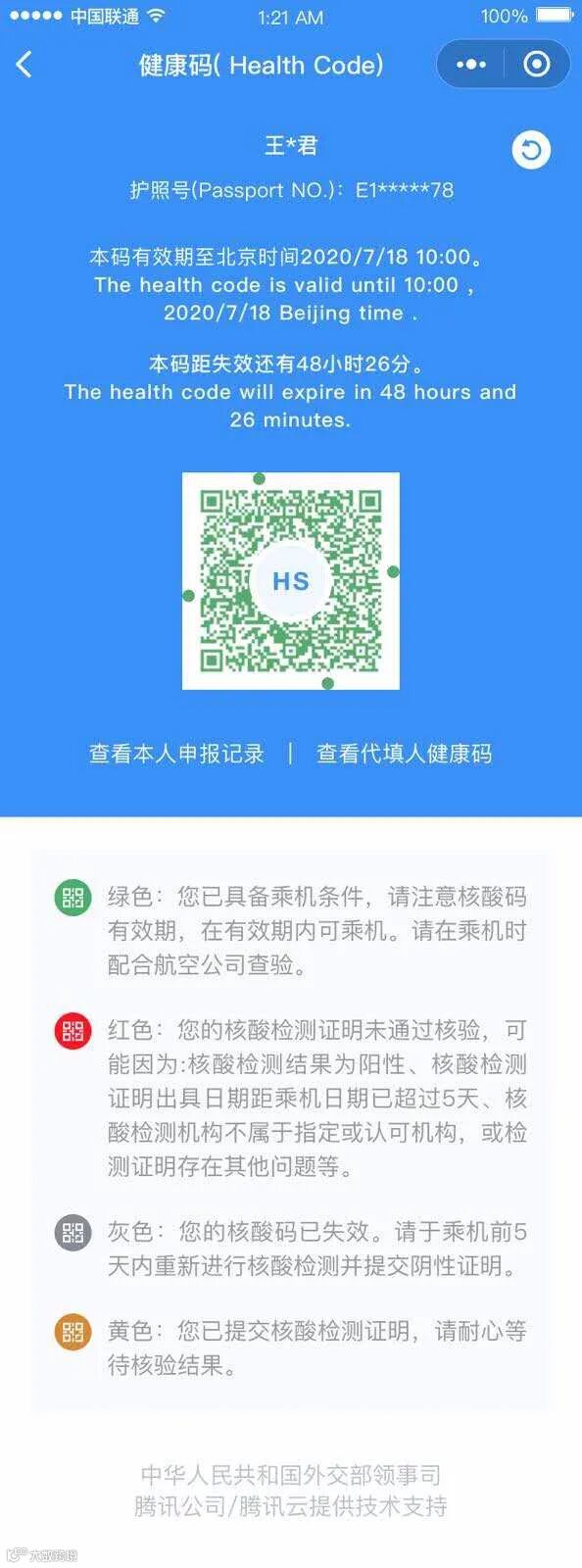 中国公民应在获得核酸检测阴性证明24小时内,通过防疫健康码国际版微信小程序(点击以下图片进入小程序),申报个人情况并拍照上传核酸检测阴性证明。经我馆复核通过后,申请人可获得带“HS”标识的绿色健康码。如需要,请点击以下链接(https://hr.cs.mfa.gov.cn/help_two/help-two/hs.html),查看“中国公民核酸检测证明申报常见问题解答”。请注意在健康码有效期内中转乘机,并在登机前配合航空公司查验。