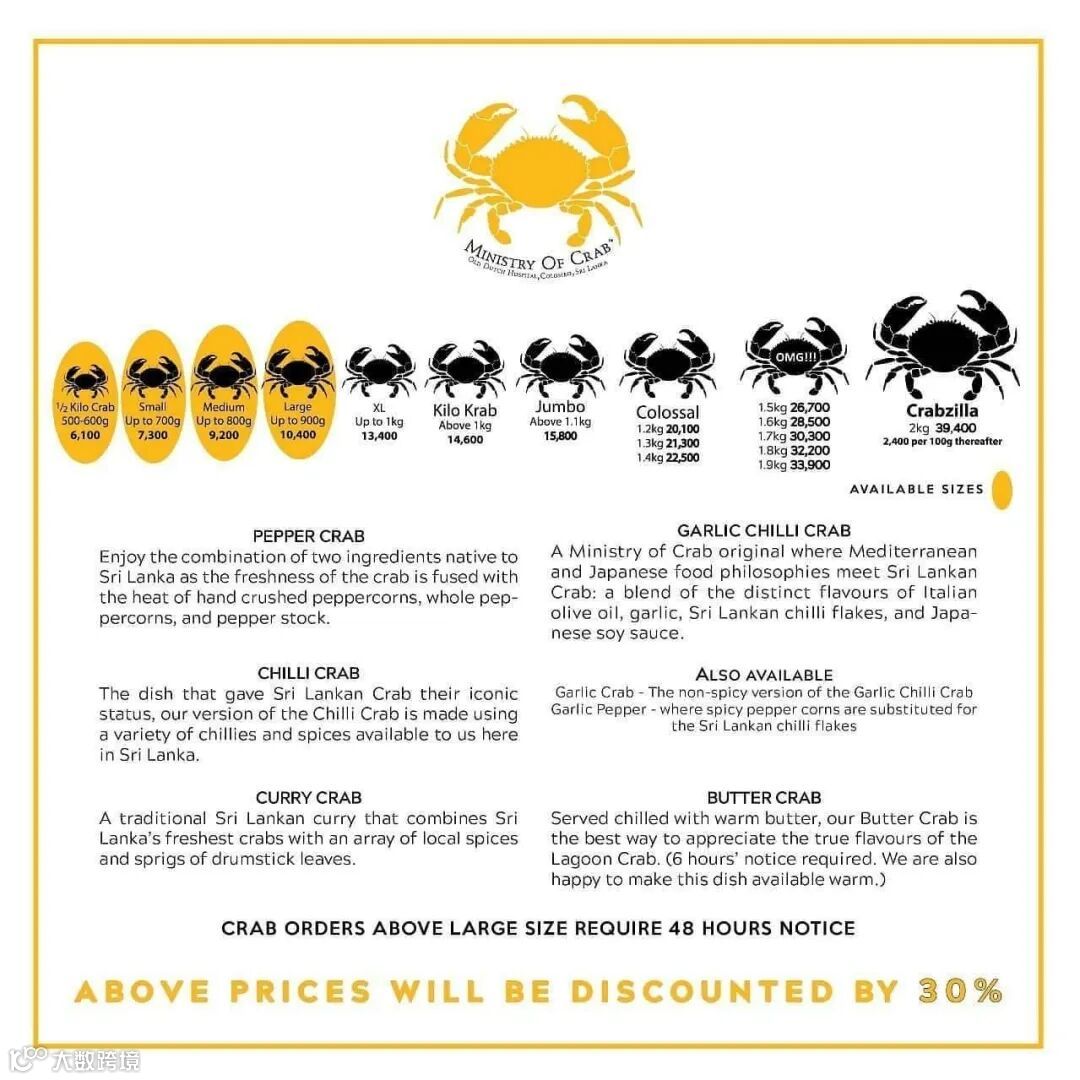 2. 大于Large尺寸的螃蟹,需提前48小时预订哦!