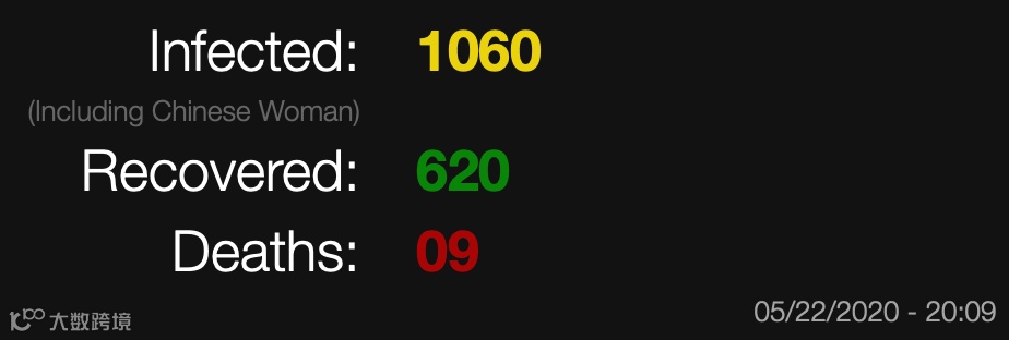 截止今日(5月22日),确诊的新冠感染者为1060例(截止兰卡时间昨晚9点半为1045例);治愈出院620例,含2月痊愈回国的中国患者;死亡9例。
